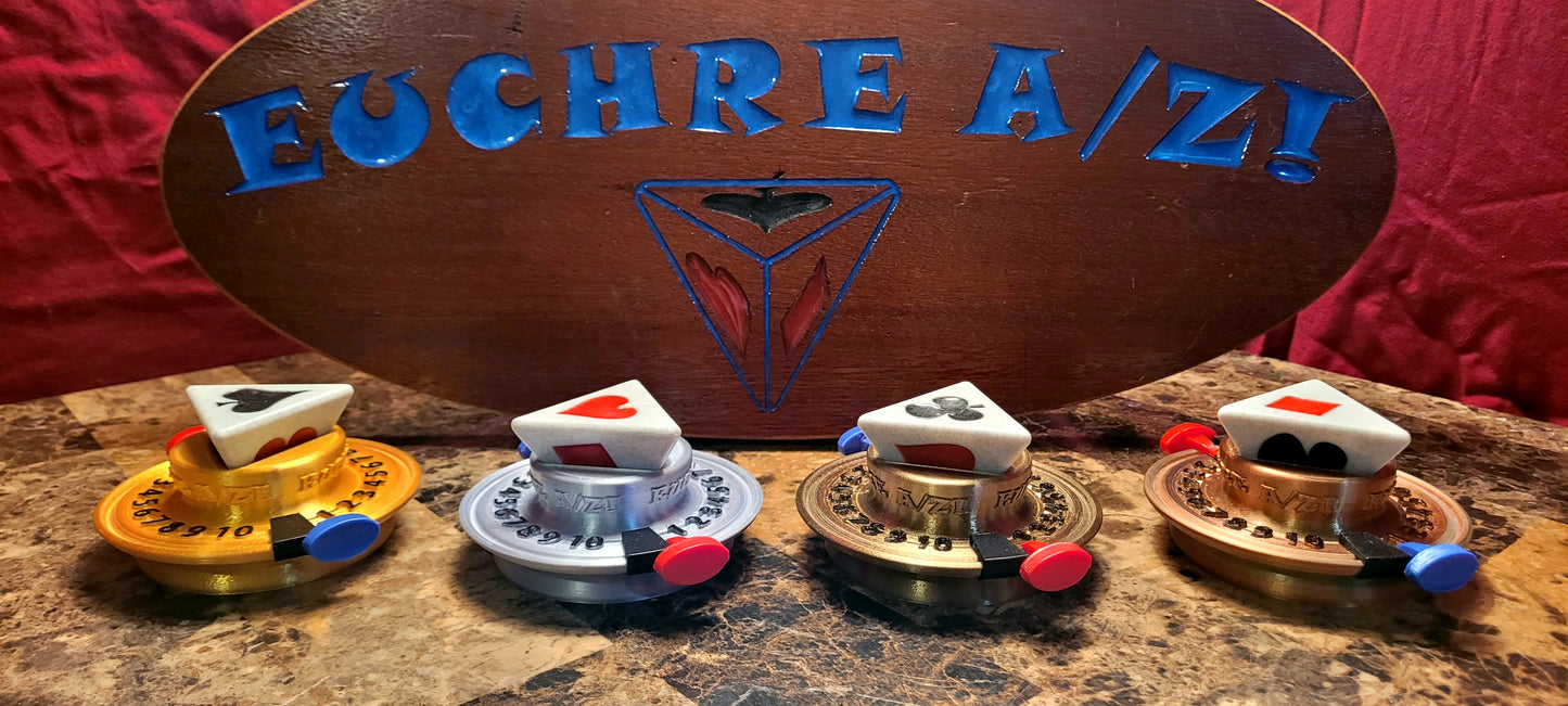 Do you ever get tired of hearing "what's trump again?" Or perhaps, tired of asking? Then you need the combination Euchre AZ Trump Marker and Scoreboard.